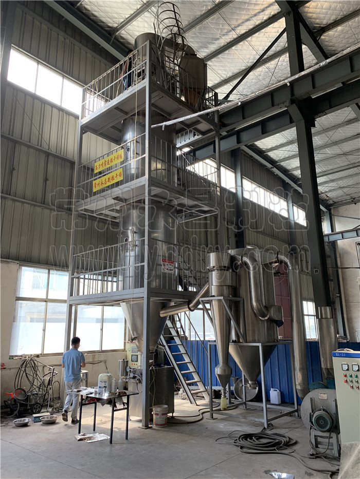 压力喷雾造粒干燥塔是采用进口雾化器借助高压均质机的压力将溶液或浆状的物料雾化成细微液滴,使表面积显著增大,经与热风进行充分热交换得以快速干燥(十几秒至几十秒),从而得到粉体或细小球形颗粒产品的设备。