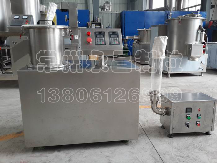 本机是通过设置旋转离心盘、鼓风机、气动喷枪,将湿颗粒制成美丽的球丸。将前道工序做成的湿颗粒投入旋转离心盘内,启动鼓风机后再将旋转离心盘启动,使湿颗粒受到环隙空气浮力、旋转离心力、自身重力作用,呈环周绳股状运动,从而形成真球度极高的球丸。