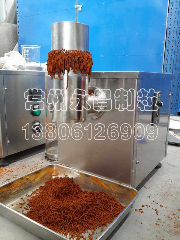 在化学物品方面用于把混合的(湿)粉未碾成颗粒, 在制药和食品工业上用作(湿)粉末混合物和麦芽乳品等的混合原料制成型的颗粒,用作冲剂,鸡精,海鲜精等。只需要20-30克左右的粉未就可以做试验。连续加工可以达1-10公斤/小时,颗粒直径为0.8,1.0,1.2,1.5,1.8,2.0,2.5,3.0(mm) 长度一般在3-5(mm)。