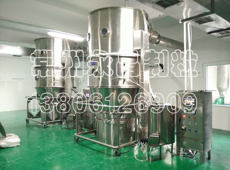 工艺流程:将制粒用粉末物料投入流化床内,冷空气经过滤器进入,再由加热器升温,冷风温度升至工艺温度后,进入流化床内,使粉末呈流化状循环流动,同时喷入雾状粘合剂湿润容器内的粉末,使粉末凝聚成疏松的小颗粒,成粒的同时,水份不断蒸发,并由热空气带走。