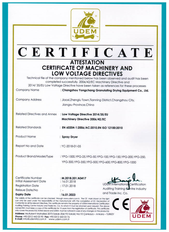 压力喷雾造粒干燥机 获得欧盟CE认证