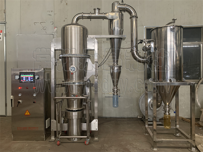孢子粉收粉干燥机散粒状固体物料由加料器加入流化床干燥器中,过滤后的洁净空气加热后由鼓风机送入流化床底部经分布板与固体物料接触,形成流化态达到气固的热质交换。孢子粉由一级旋风、二级旋风和布袋除尘器收集。物料干燥后由排料口排出,废气由沸腾床顶部排出经旋风除尘器组和布袋除尘器回收固体粉料后排空。蒸气、电、热风炉均可配用(按用户要求配套)。