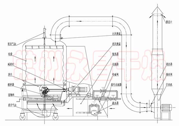 空气经加热净化后,由引风机从下部导入,穿过料斗的孔网板。在工作室内,经搅拌和负压作用形成流态化,水份快速蒸发后随着排气带走,物料快速干燥。