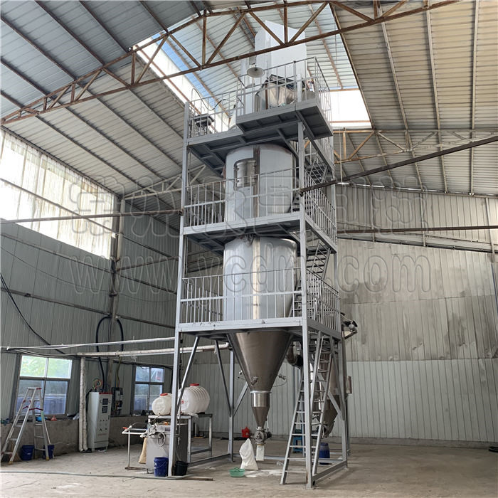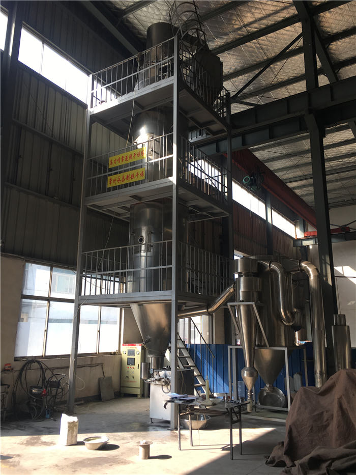 喷雾造粒是将悬浮液用雾化器喷雾于干燥室内的热气流中,使水份迅速蒸发制成细小干燥颗粒的方法。在数秒钟内即完成料液的浓缩、干燥、造粒过程。经过湿粉碎的料浆首先被雾化成雾状微液滴,水份被热空气蒸发带走后,液滴内的固相物就聚集成了干燥的微粒。喷雾造粒所制成的颗粒为空心多孔状,因此在水中的润湿、崩解性能好,并有极高的悬浮率。