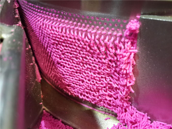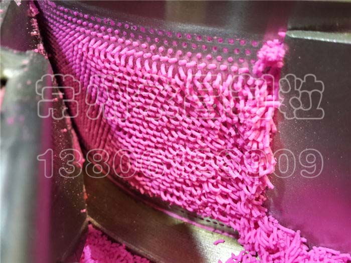 将混合均匀的软材,在辗刀的挤压下,使物料强制通过筛网,并受到刮刀的切割进而得到长度均匀的柱形颗粒。