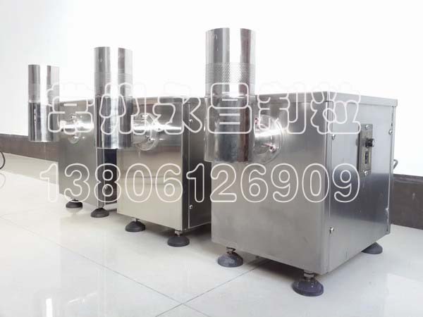1、本机是用S型碾刀,通过不锈钢筛筒的筛孔,把物料挤出颗粒的设备。在化学物品方面用于把混合的(湿)粉未碾成颗粒, 在制药和食品工业上用作(湿)粉末混合物和麦芽乳品等的混合原料制成型的颗粒,用作冲剂,鸡精,海鲜精等。只需要20-30克左右的粉未就可以做试验。连续加工可以达1-10公斤/小时,颗粒直径为0.8,1.0,1.2,1.5,1.8,2.0,2.5,3.0(mm) 长度一般在3-5(mm)。