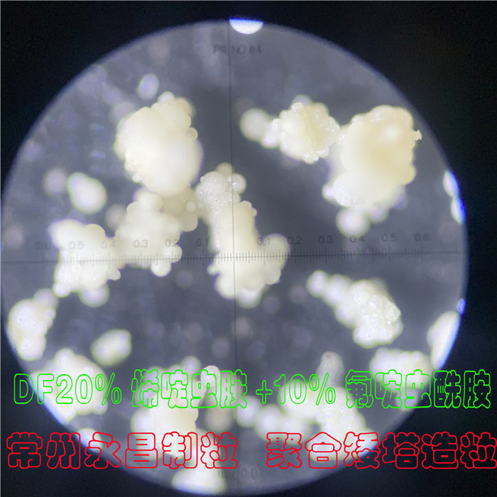 近期试的DF干悬浮剂:50%噻虫嗪.烯啶虫胺、50%氟啶虫酰胺.啶虫脒、80%吡蚜酮+呋虫胺、80%吡蚜烯啶、12%噻霉酮、60%吡唑代森联、50%戍唑醇+25%肟菌酯、40%呋虫胺+20%烯啶虫胺、75%百菌清、20%烯啶虫胺+10%氟啶虫酰胺。采用我公司新研发的喷雾流化造粒塔试验,DF颗粒的崩解、润湿度、耐磨性等都比现在市场上的高塔好。